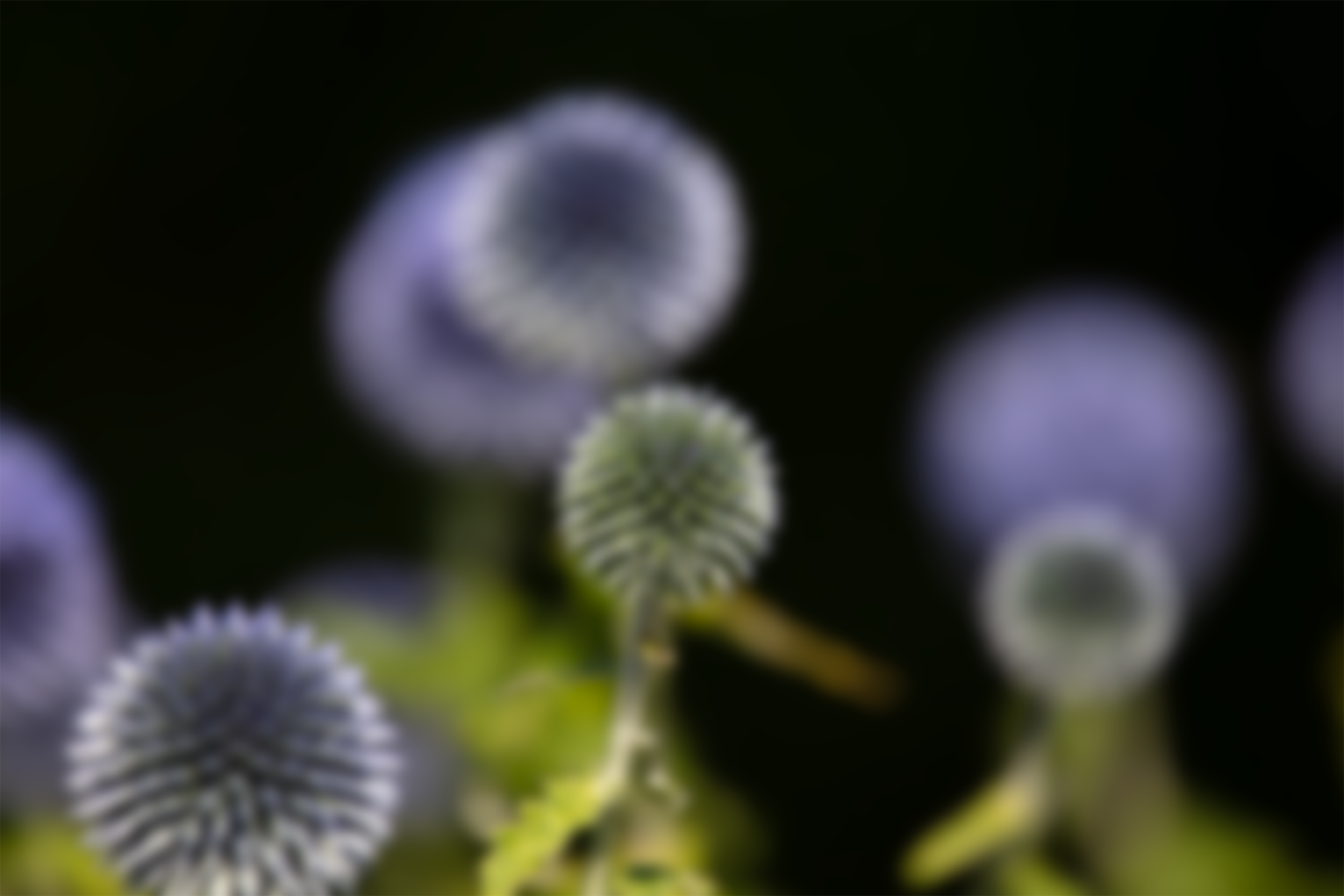 Två bumblebees samlar nektar från en blå, taggig blomma med en grön, suddig bakgrund.